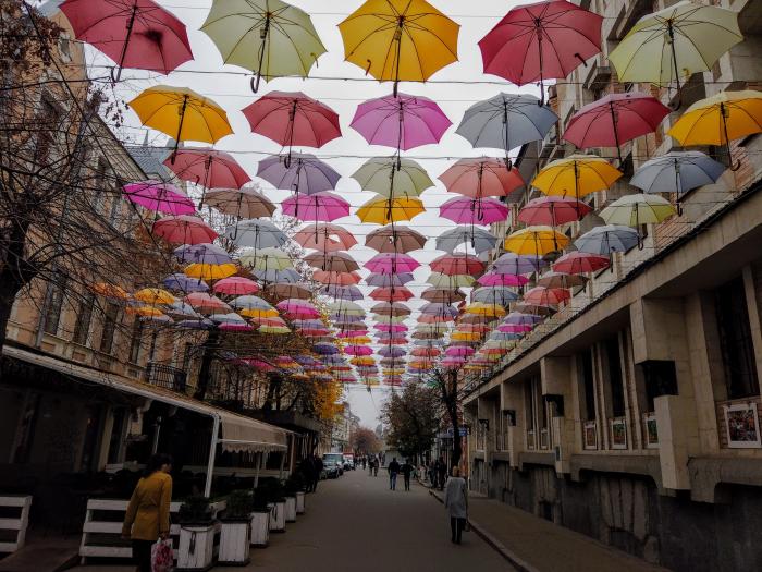 В течение нескольких последних лет улицу украшает уникальная инсталляция из разноцветных зонтиков. Она манит всех неравнодушных к хорошим фотоснимкам, ведь по-настоящему является великолепной фотозоной.