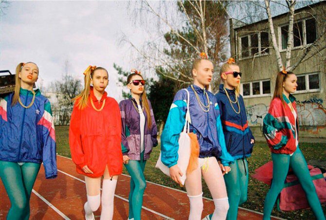 В 90-ті пропагували активний спосіб життя. З’явилася велика кількість безкоштовних спортивних секцій, в які містяни записувалися і мали змогу ходити кожен день після роботи. Тому спортивний костюм увійшов в моду. Крій його був звичайним і далеко від натяків на жіночність. Найбільш ходовим був костюм марки «Адідас».